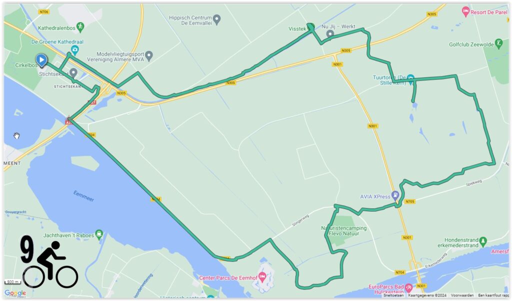 Deze route gaat vanaf Chamavi, via de fietsbrug lang de Hoge Vaart richting het Horsterwold bij Zeewolde. Daar komt u twee prachtige uitzichtpunten tegen; De “Tuurtoren De Stille kern” en 550 m. verder De “Circle of Life”. Door het Horsterwold fiets u verder richting het Hulkesteinse bos, waarna we via de dijk weer terug gaan naar Chamavi.